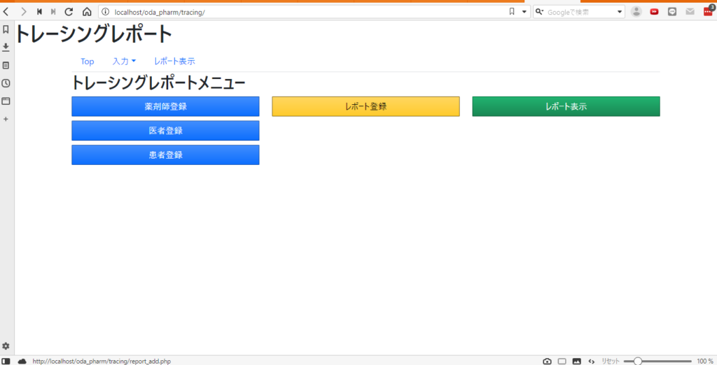まずは医師、薬剤師、患者を登録。そしてレポート登録画面では先の3種類をセレクトボックスで選び本題を入力といった流れです。ここでセレクトボックスを選んだのは、そこまで多くはならないだろうという予測の元です。とはいってもしばらく運用しているとどうしてもデータは増えてしまうので、コンボボックスのような検索、セレクトのような形式に変更しなければならないかもしれない。