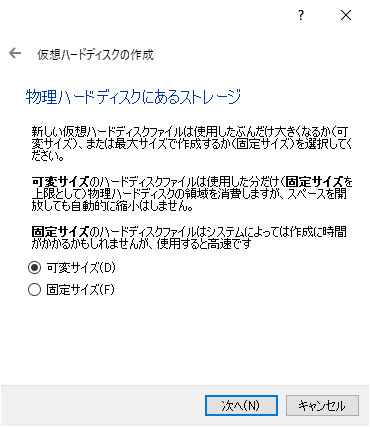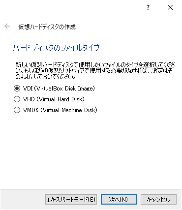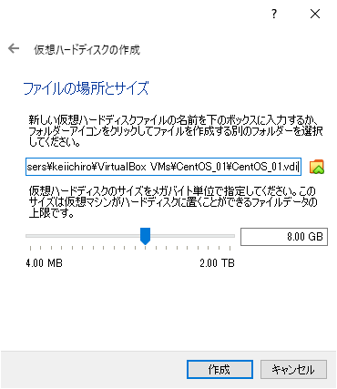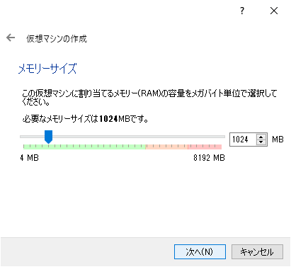 VirtualBoxに新規作成でメモリ、HDDなど設定する。基本的には初期値のまま作成。