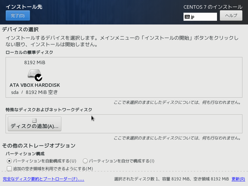 インストール先のアイコンがビックリマークだったので、VirtualBoxで設定した8GBのHDDを選択して完了する。