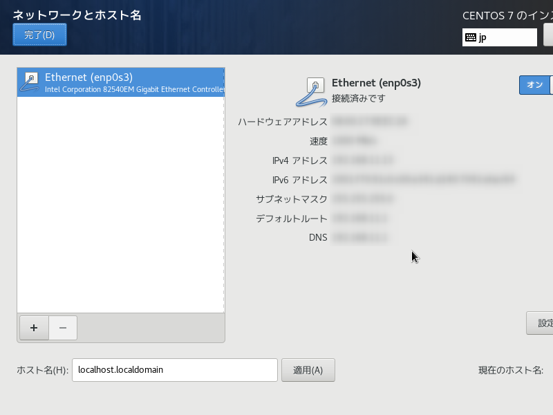 ネットワークとホスト名のほうは特にビックリマークにはなっていないが、Ethernet(enp0s3)が初期値でオフとなっているのでオンにしておく。