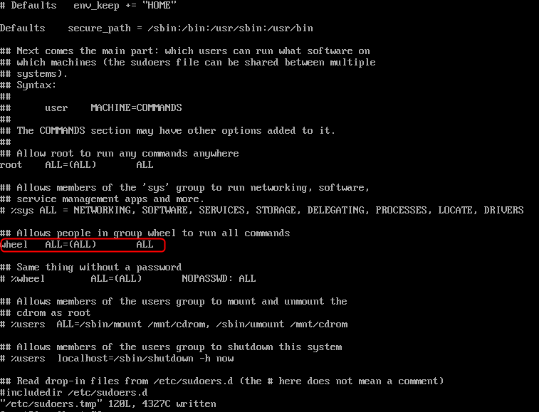 このファイルの中の「#wheel ALL=(ALL) ALL」の一行がコメントアウトされているので、#記号を削除して保存する。