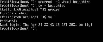 次に一般ユーザー(keiichiro)をwheelグループに所属させる。usermod -aG wheel ユーザー名と入力してエラーがなければOK。一応、ユーザーを切り替えてグループの確認。wheelがあればOK。