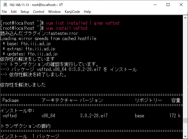そこでyum install vsftpdと入力してインストール。