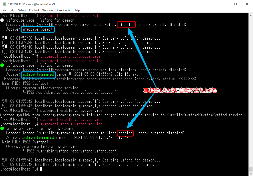 赤枠の部分がdisabledとなっているのでsystemctl enable vsftpd.serviceと入力してenabledにしておく。これもstatusで確認しておく。