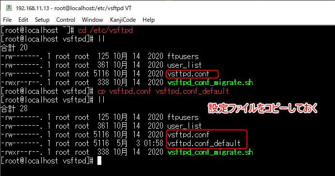 次にvsftpd.confファイルを編集するが、恒例のごとくバックアップを取っておく。ファイルの場所は/etc/vsftpd/の中にあるので、cd /etc/vsftpdと入力して移動する。llと入力しているのはディレクトリの中身を確認するためだが、ls -laと同じらしい。llのほうが簡単なのでこちらを個人的には記憶。