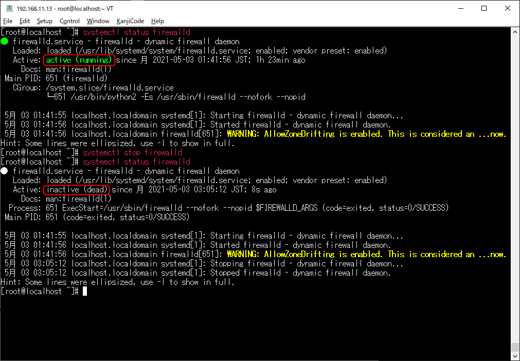 systemctl stop firewalldと入力してinactive(dead)となっているので停止状態。