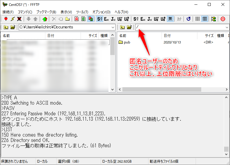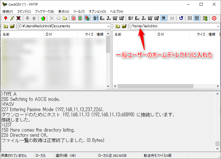 無事に接続することができたのでこれでダウンロード、アップロードが可能となる。やっぱり匿名ユーザーとは違いホームディレクトリに入れるんですね。