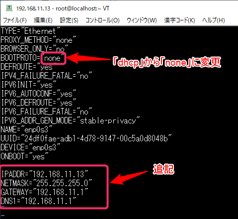 まずは vi /etc/sysconfig/network-scripts/ifcfg-enp0s3 と入力しifcfg-enp0s3ファイルを開く。この中のBOOTPROTO=”dhcp”のところを“none”に変更。そして最後の部分にIPアドレス、サブネットマスク、デフォルトゲートウェイ、DNSのアドレスを追加する。