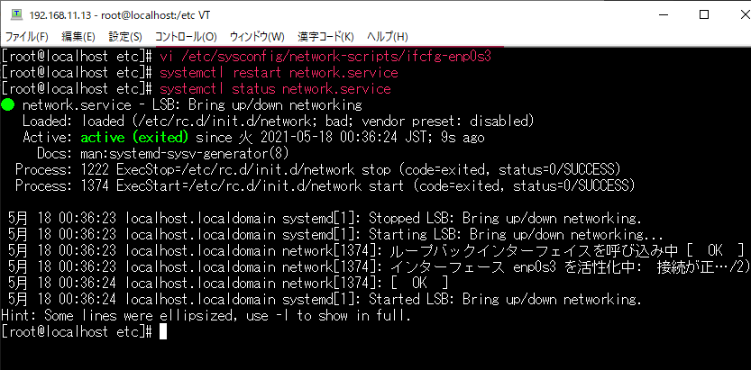 設定を触ったので、ネットワークを再起動しておく。systemctl restart network.service と入力して再起動し、systemctl status network.service で起動しているかどうかチェック。