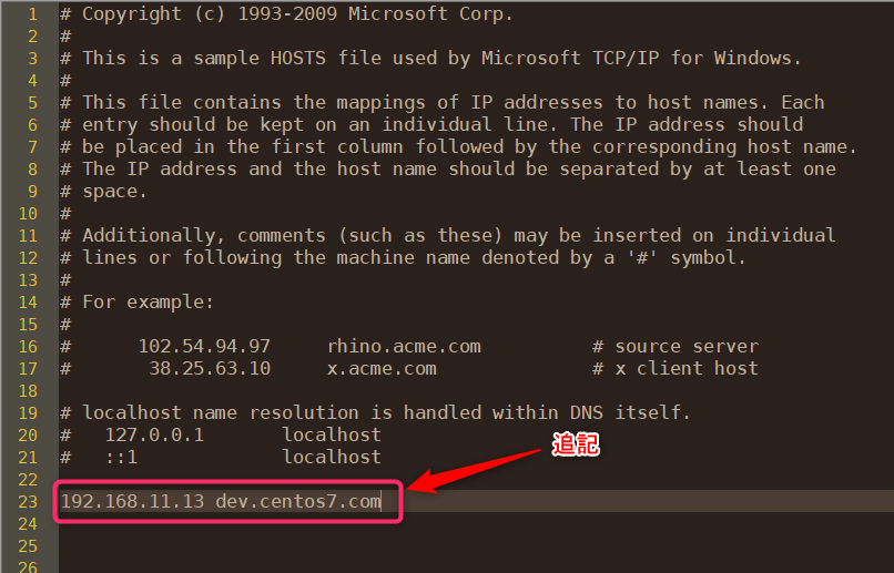 私の環境では C:\Windows\System32\drivers\etc の中にhostsのファイルがあった。そのファイルを管理者権限で開きホスト名とIPアドレスを追記。なかなか良い名前が思いつかなかったがここではdev.centos7.comとした。