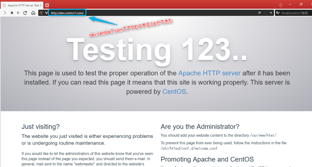 IPアドレスとホスト名を対応させたのでブラウザを開きhttp://dev.centos7.comと入力。