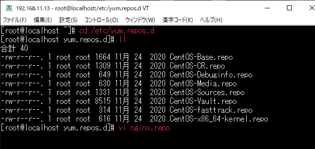 公式ページによるとまずはリポジトリの作成。リポジトリを作成しておけばyumでのインストールができ簡便である。cd /etc/yum.repos.dと入力し中をのぞいてみる。