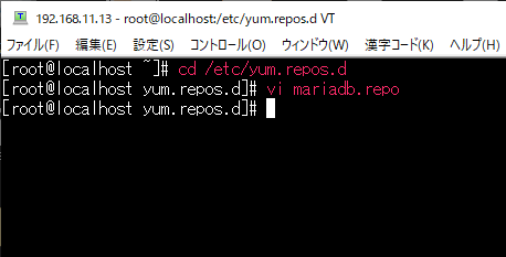 cd /etc/yum.repos.dと入力してリポジトリが入っているディレクトリに移動。その中にmariadb.repoというファイルを作成する。