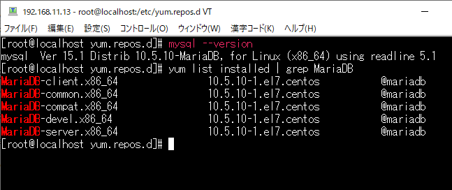 インストール後、mysql –versionと入力しバージョンの確認。また、yum list installed | grep MariaDBと入力すると目的のver.10.5が入っていることを確認できた。