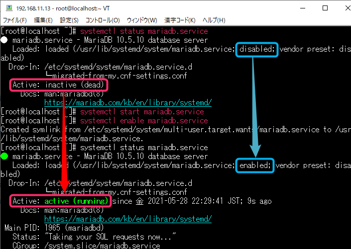 さっそくmysqlの起動。いつものようにsystemctl status mariadb.serviceと入力してステータスを確認。もちろんインストールしただけなので起動はしていないので、立ち上げて自動起動の設定もした。