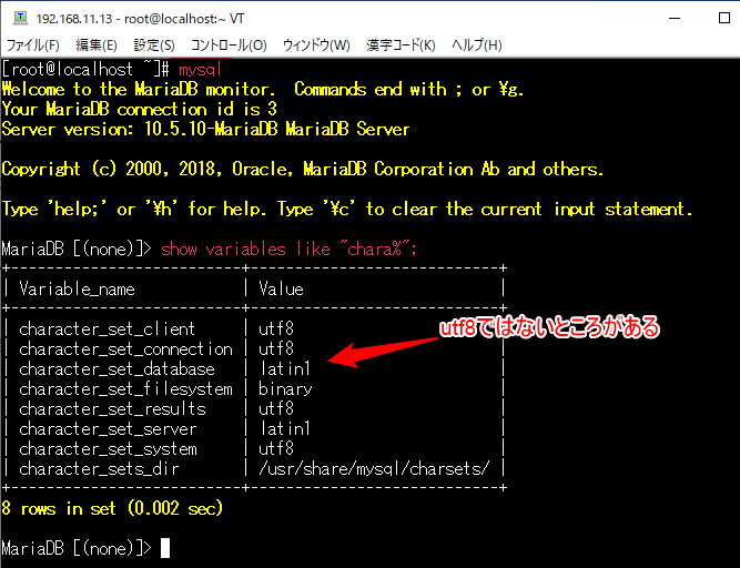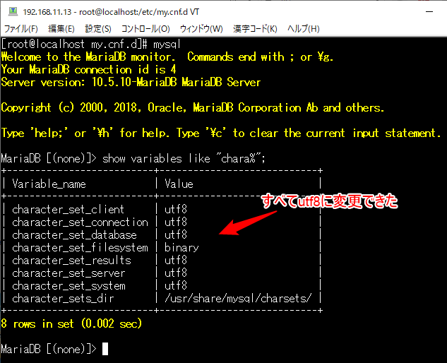 もう一度MariaDBに入って文字コードを確認すると、すべてutf8になっていた。