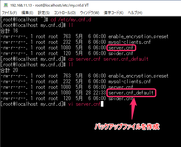 まずはcd /etc/my.cnf.dと入力してディレクトリを移動。その中のserver.cnfを今回触るので、いつものようにバックアップ用のファイルを作成しておく。