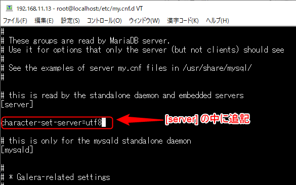 viエディタを起動してその中の [sever] 内に character-set-server=utf8 と入力。これはコメントアウトを外すとかいうのではなく完全に追記。