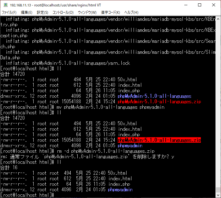 ダウンロードが終わったら今度は解凍。unzip phpMyAdmin-5.1.0-all-languages.zipと入力することでzipファイルは解凍される。ls laで確認するとphpMyAdmin-5.1.0-all-languagesというディレクトリが新しくできている。このままでは名前が長いので、rm phpMyAdmin-5.1.0-all-languages phpmyadminとしてディレクトリ名を変更。