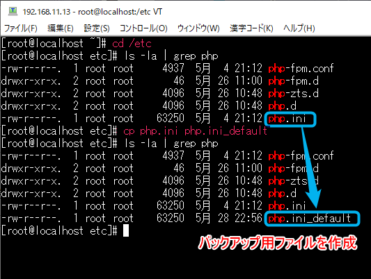 今度はcd /etcに移動してphp.iniファイルを変更する。ここでも先ほどと同じようにバックアップ用のファイルを作成。cp php.ini php.ini_defaultと入力してバックアップしておく。
