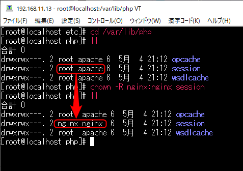 先ほど指定したディレクトリに移動。cd /var/lib/phpと入力して中身を確認。先ほど指定したsessionのディレクトリを見つけることができた。これも所有者をnginxに変更しておく。