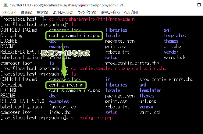 今度はphpMyAdminの設定をする。先ほどダウンロードしたphpmyadminのディレクトリに移動。その中のconfig.sample.inc.phpをコピーしてファイル名をconfig.inc.phpとする。