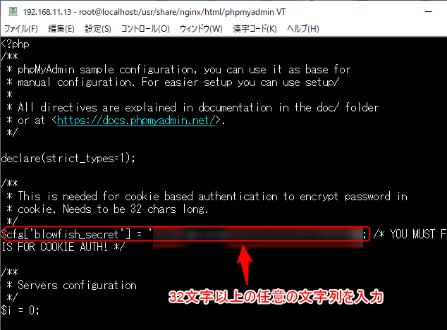 viエディタで中身を確認。$Scfg[‘blowfish_secret’]=”の中に32文字以上の任意の文字列を入力する。この文字列は特にのちのち聞かれることもなく、内部での処理に使われるだけなので適当でOKと思われる。