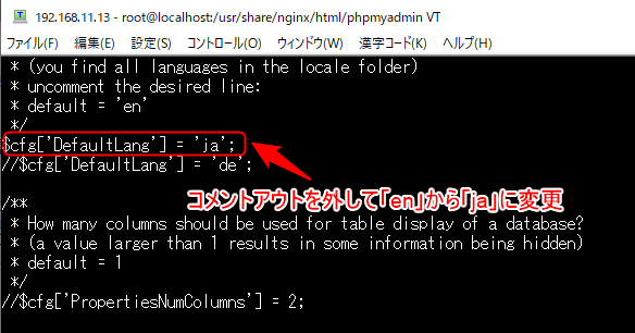 下のほうに言語設定の部分があるので、ここのコメントアウトを外して「en」から「ja」に変更。
