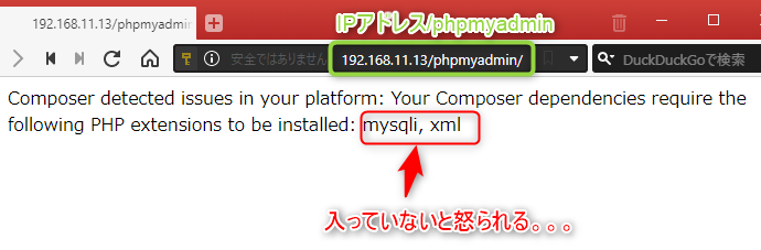 さっそくIPアドレス/phpmyadminと入力してみる。しかし、エラー表示がでるのみ。mysqliとxmlが入っていないと怒られる。