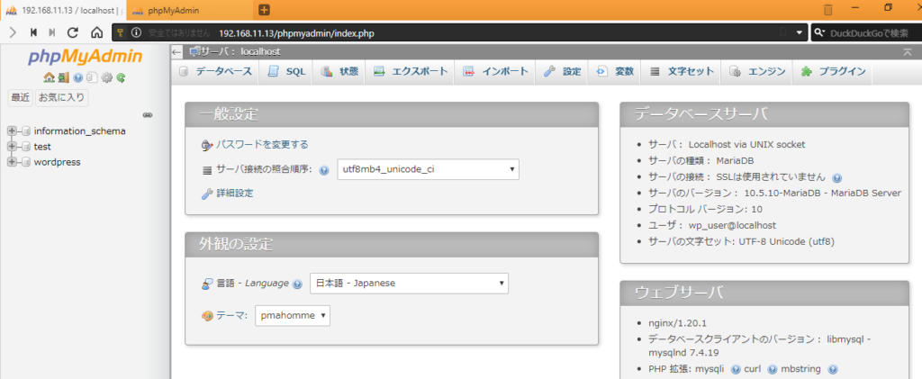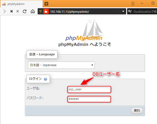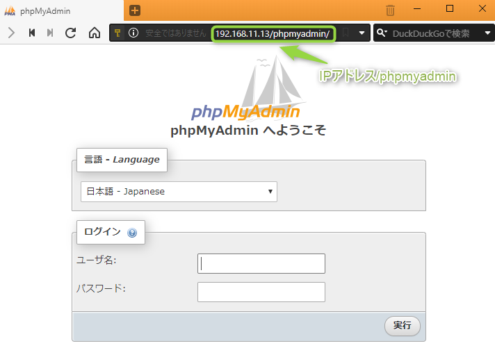 データベースの作成、ユーザーの作成とパスワードの設定ができたのであらためてブラウザを開き、IPアドレス/phpmyadmin にアクセス。