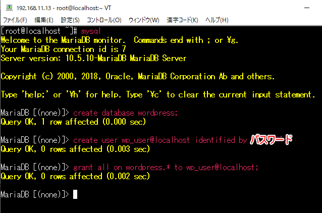 次にユーザーの作成とパスワードの設定。 create user wp_user@localhost identified by ‘パスワード’;