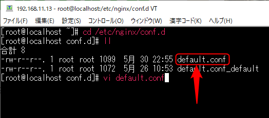cd /etc/nginx/conf.d と入力して目的のファイルのあるディレクトリに移動。ここでvi default.confと入力してviエディタを起動。