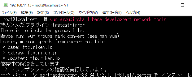 まずはパッケージのインストール。yum groupinstall base development network-toolsと入力して3種類のパッケージをインストールする。