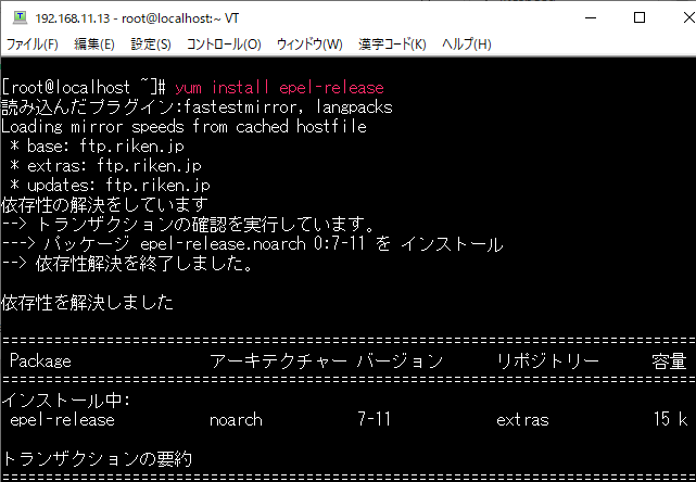 次にEPELのインストール。yum install epel-releaseと入力してインストール