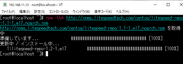 次にlitespeedのリポジトリのインストール。rpm -Uvh http://rpms.litespeedtech.com/centos/litespeed-repo-1.1-1.el7.noarch.rpmと入力しインストール。