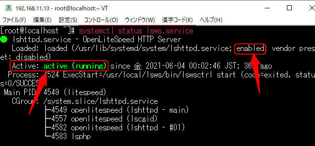 まずはlswsの起動とのことで、いつものsystemctl status lsws.serviceを入力してステータスを確認。