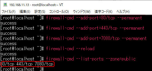 一応、firewall-cmd –list-ports –zone=publicと入力して開放されているかチェック。