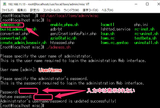 ./admpass.shを入力し、ユーザー名とパスワードを設定する。パスワードは入力中表示されないので慎重にタイピングすれば大丈夫。