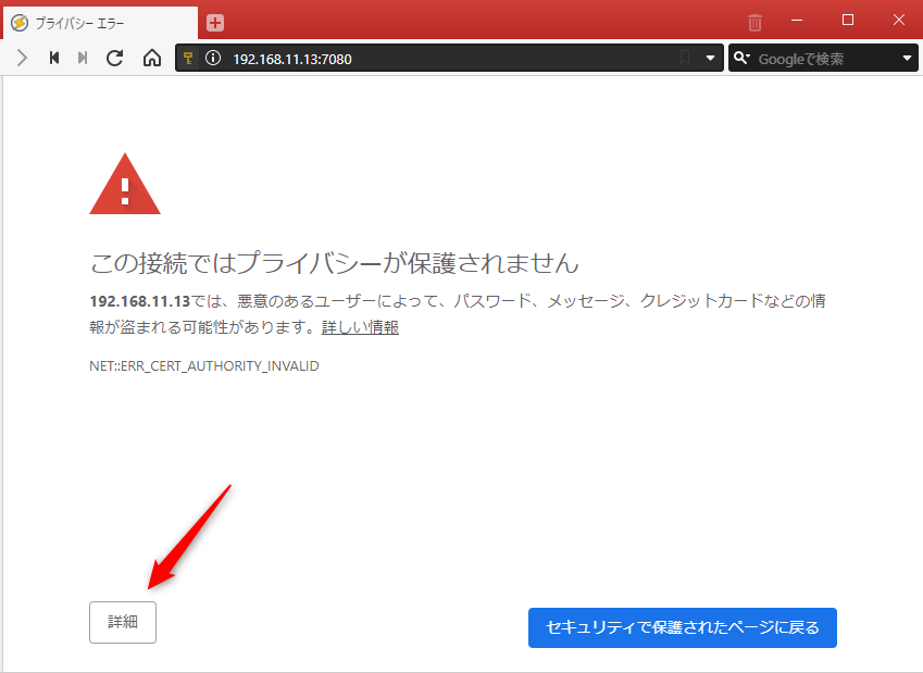 適当なブラウザでIPアドレス:7080を入力するとエラーメッセージ。ここで気にせず詳細ボタンから強引にページを開く。