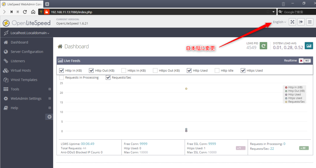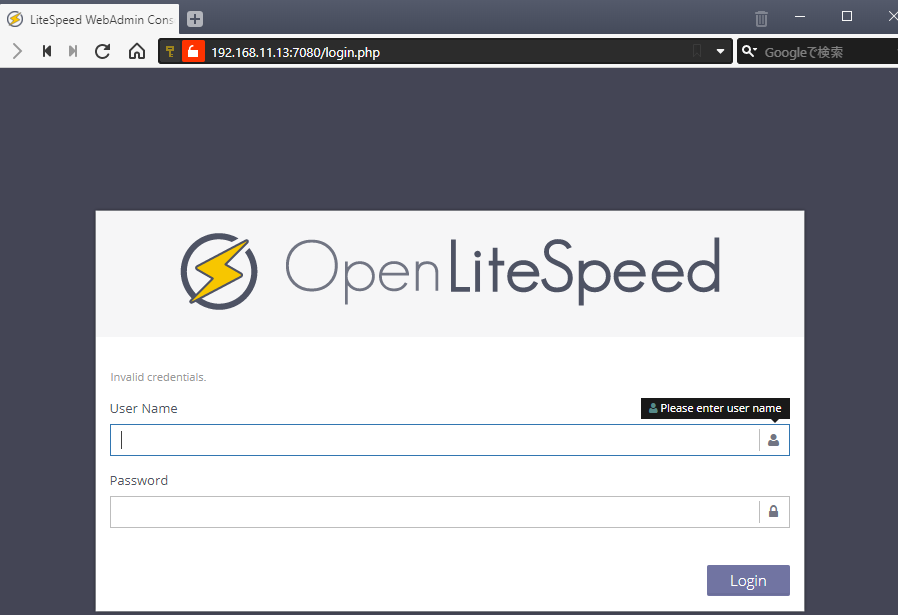 するとLiteSpeedのログイン画面が表示される。ここで先ほど設定したユーザー名とパスワードを入力してログインする。