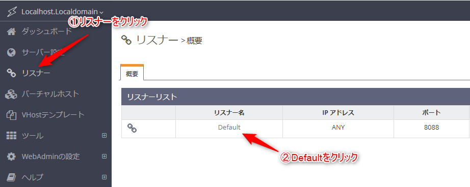 まずは左のメニューからリスナーをクリック。リスナーリストからDefaultとクリック。