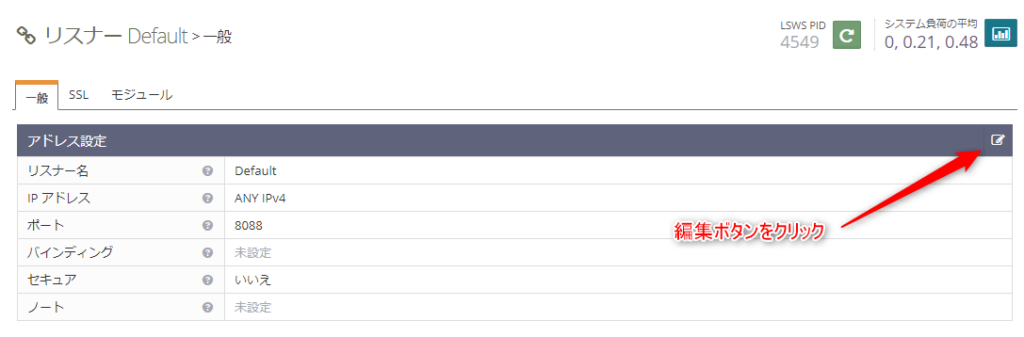 ここで一般のタブでポートの表示が確認できる。初期値では8088となっているので、右上の編集ボタンをクリック。
