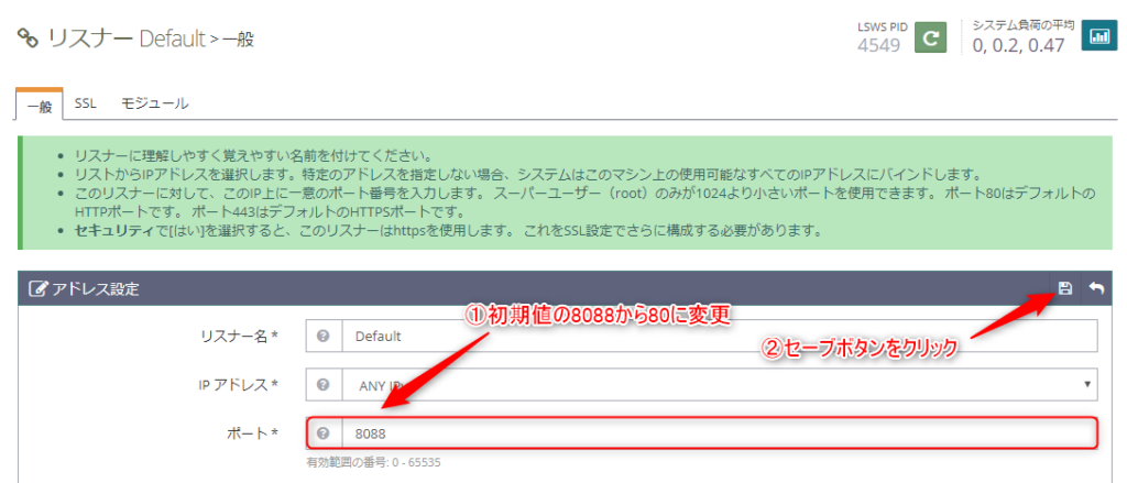 ポートの部分を8088から80に変更して、右上のセーブボタンをクリック。