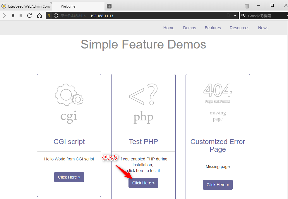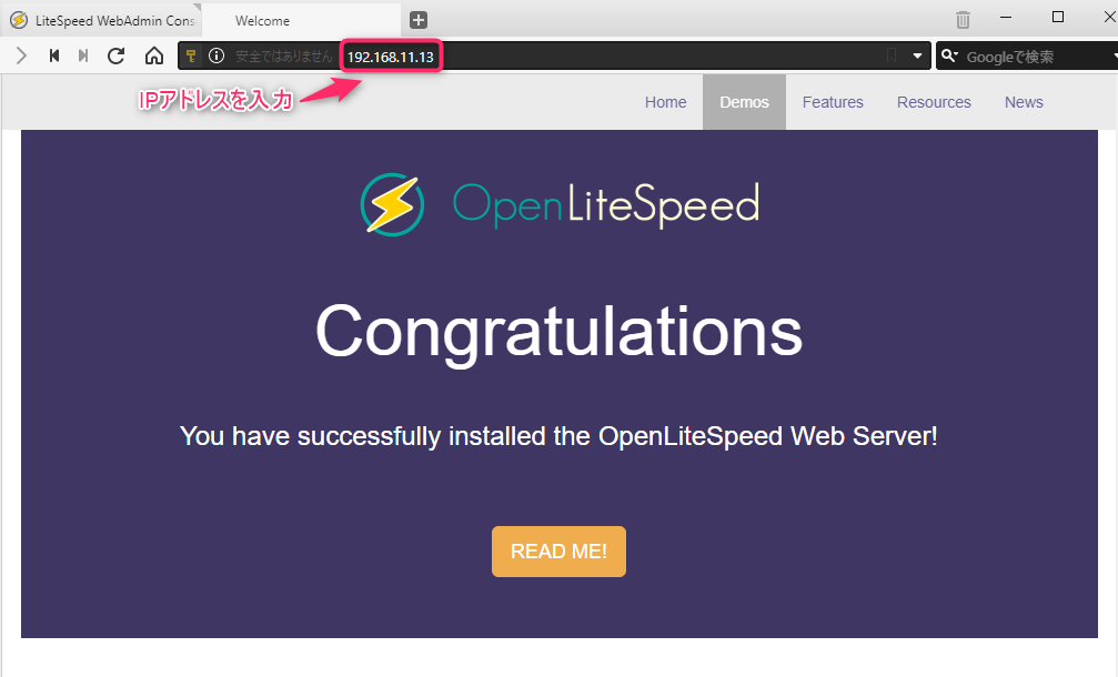 ここで新たにIPアドレスのみでアクセスする。すると下記のような画面がでればOK.