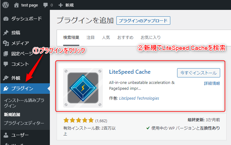 プラグインの新規追加を選び、検索窓にLiteSpeed Cacheを入力し検索。