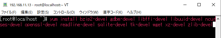 次に必要なものをインストール。yum install bzip2-devel gdbm-devel libffi-devel libuuid-devel ncurses-devel openssl-devel readline-devel sqlite-devel tk-devel wget xz-devel zlib-deve と入力して一気にインストール。正直インストールしたものが何なのかよくわからず。唯一わかるのはダウンロードに必要なwgetぐらい・・・。