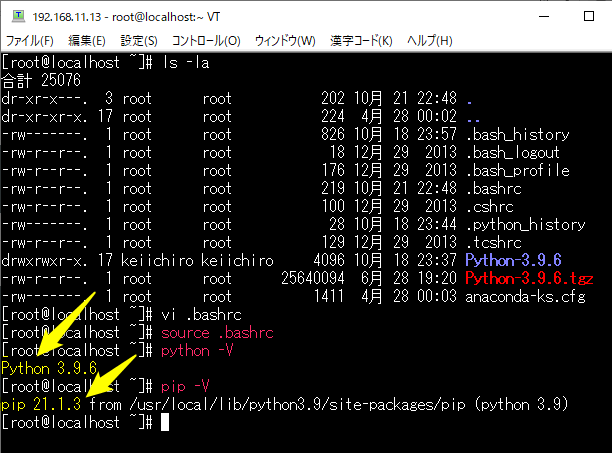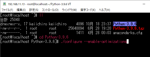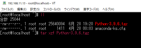 ダウンロードができたらファイルを解凍。tar xzf Python-3.9.6.tgz と入力して解凍する。