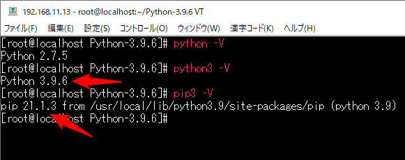 python -Vと入力してバージョンを確認すると2.7.5。おやっと思ったが、pyhon3 -Vと入力すると目的の3.9.6が表示された。