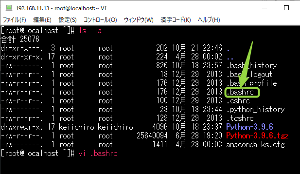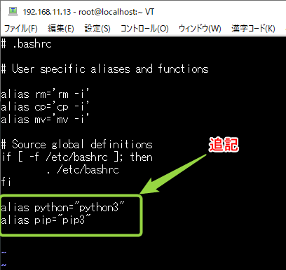 最終行に alias python=”python3″ と alias pip=”pip3″ と入力。これでpythonと入力するとpython3が呼ばれるはず。